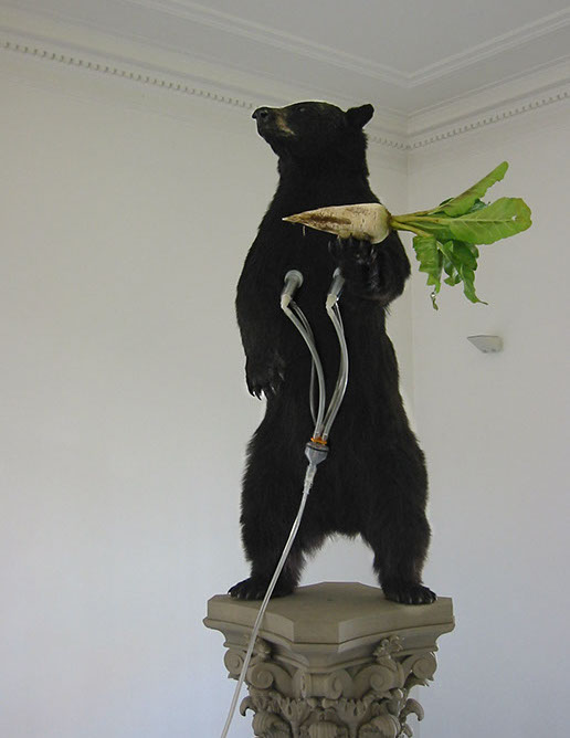 Die Berliner Zuckerbarin. Lactating Bear holding a Sugar Beet in her paw, standing on top of a Corinthian column, acting as an antenna. Hamburger Bahnhof, Berlin. 2003.