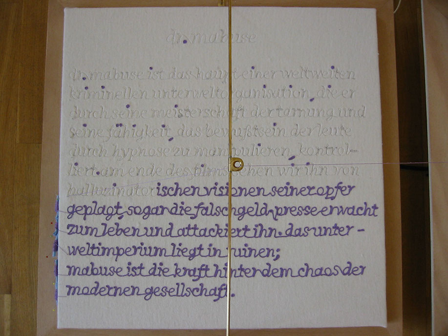 Four tapestries surround the braider, each is embroidered with texts and symbols representing a different aspect of Berlin’s history: a Durchsteckschüssel, a type of double-headed key found only in Berlin; a synopsis of Fritz Lang’s expressionist film Dr Mabuse, 1922; a Linden leaf, and its attendant mythology; finally a map of Berlin indicating the original gates to the inner city. During the course of the exhibition the embroideries are gradually unpicked, but the texts and images remain readable from the pattern of their stitch holes.