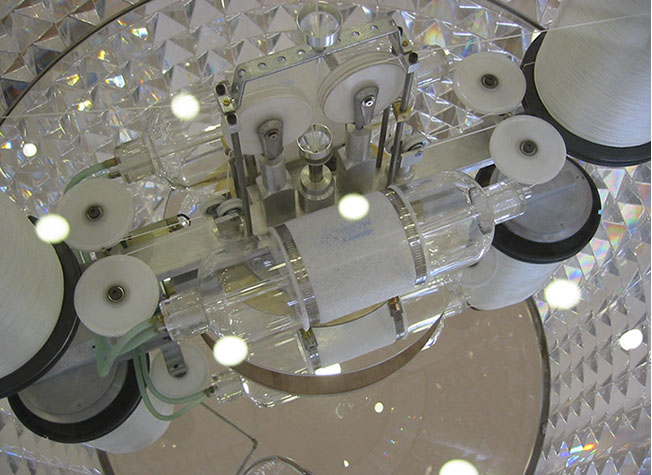 Die Berliner Zuckerbarin: Secondary Prismatic Chamber, close up of the two spools of glass thread being bonded with two separate sugars on its way to being twisted to the mother thread coming from the Primary Prismatic Chamber. 2003.