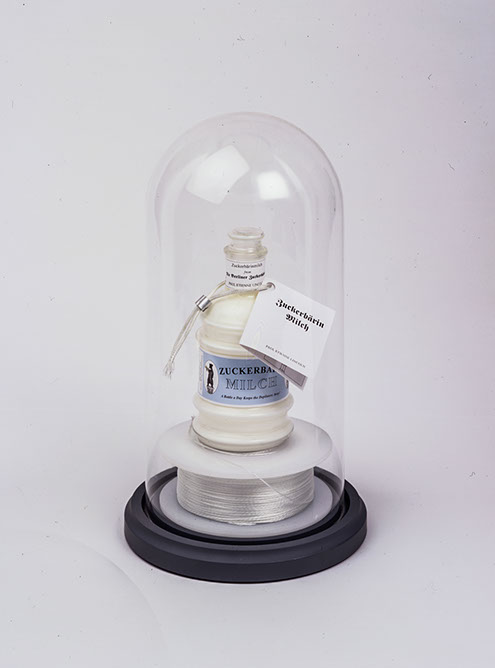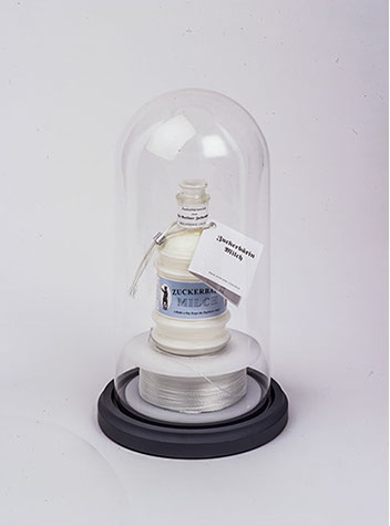 Die Berliner Zuckerbarin, Milk from the Zuckerbarin with a section of the finished DNA sugar thread around the neck of the bottle. 2003 See Editions.