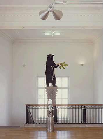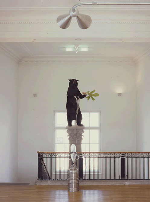 A large female bear, a symbol of Berlin since 1280, stands on a Corinthian column, modeled on those at the Reichstag. This column, wound with copper tubing around its base, serves as an elaborate antenna, one attuned to receive a particular frequency, that of a radio station specializing in tan go music. The bear is excited by a single song Das ist die Berliner Luft! (It’s Because of the Berlin Air!) On hearing this popular song the bear is milked by an automated goat milking machine attached to her two teats,and the milk pumped into an adjacent milk churn.