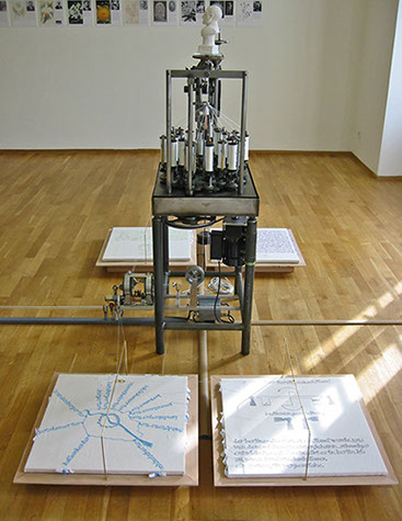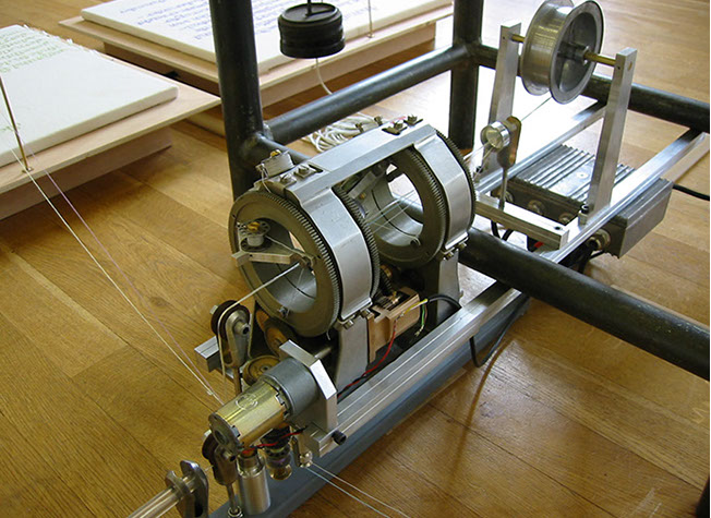 Die Berliner Zuckerbarin: The sugar threads enter the Double Helix Encoder, which draws four threads from the four tapestries. Hamburger Bahnhof. 2003.