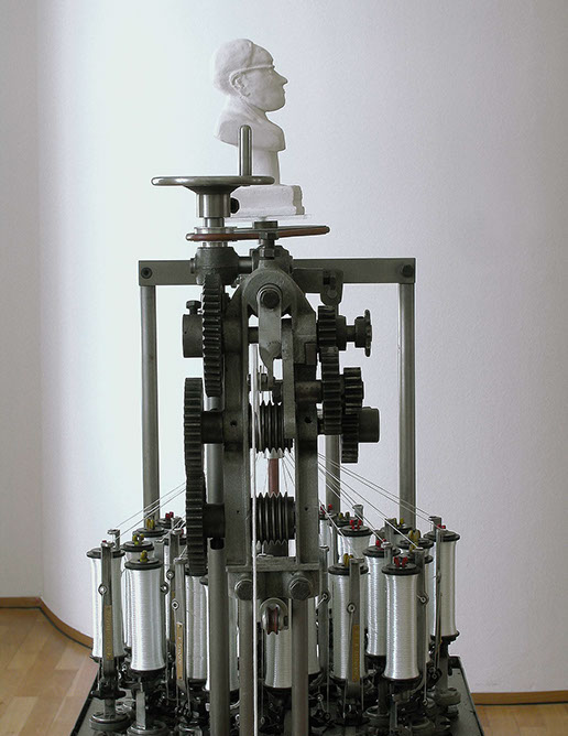 Die Berliner Zuckerbarin: 24 instigators sugar threads, on the Main Braiding Machine, the bust of Max Delbruck is wound with the final DNA of Berlin. 2003.