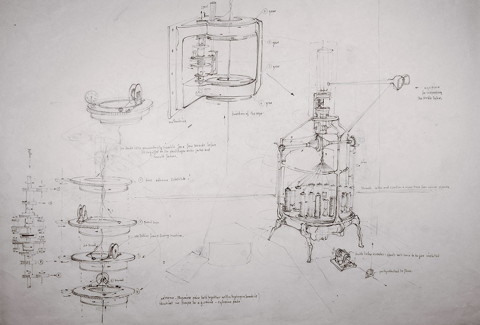 Die Berliner Zuckerbarin: Early drawing of the Braiding Machine mechanism and how the counter rotating drums on the Helix Encoder form the double helix strand around the mother thread. 2003.