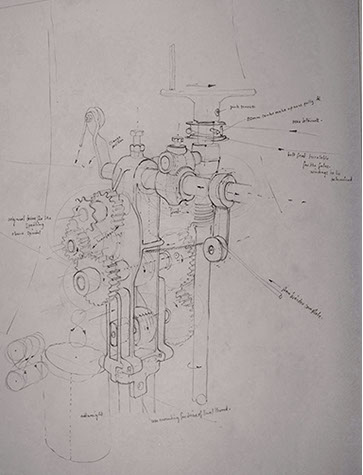 Die Berliner Zuckerbarin: Drawing of the gearing on the Braiding Machine lace drawing mechanism. 2003.