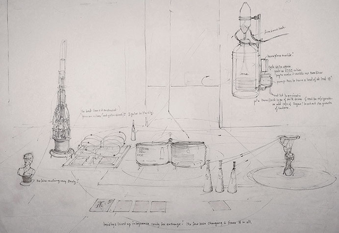 Die Berliner Zukebarin: An early layout of various elements, the braiding machine and the relationship to the tapestries, were later changed. 2002.