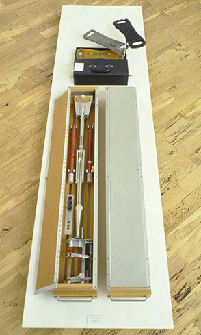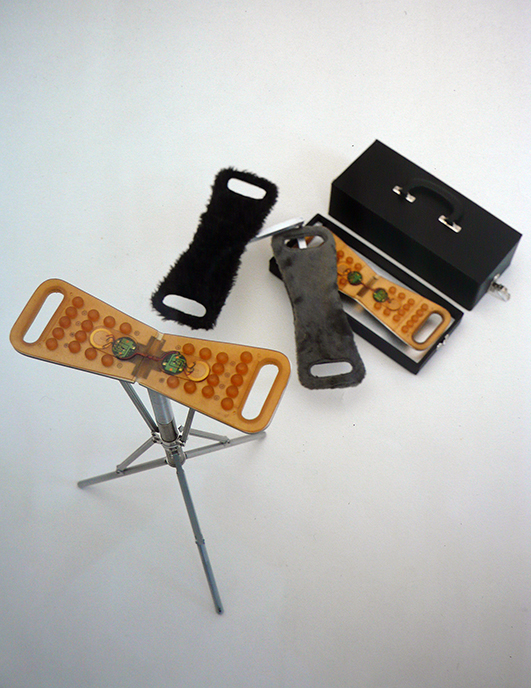 Equestrian Opulator: Seat cover set in a faux Armadillo transport case, the EQ Vibratory Stimulator is shown mounted to an Equestrian Opulator in the foreground. 2000. See Editions