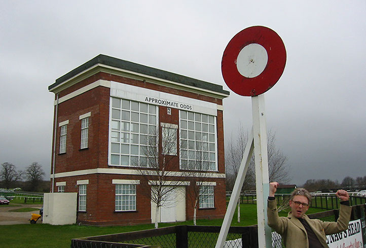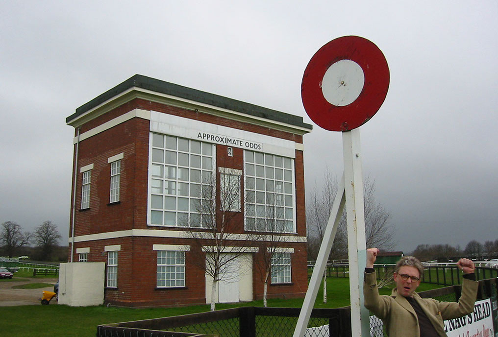 Equestrian Opulator: The House of Approximate Odds in the center of Catterick racetrack, North Yorkshire, England the venue of the installation of Equestrian Opulators. An eager racing punter displaying his euphoria at the winning post. 2001