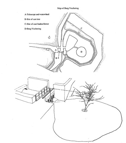 As visitors to the castle chance upon the telescope and look through its eyepiece an image of the transparent linden tree, reflected in the water, is visible in a circular frame. The action of the visitor’s eye against the eyepiece activates a pump attached to the waterwheel thus emptying the conical drain. The waters quickly begin to fall away around the trunk causing the tree to appear isolated in a void.