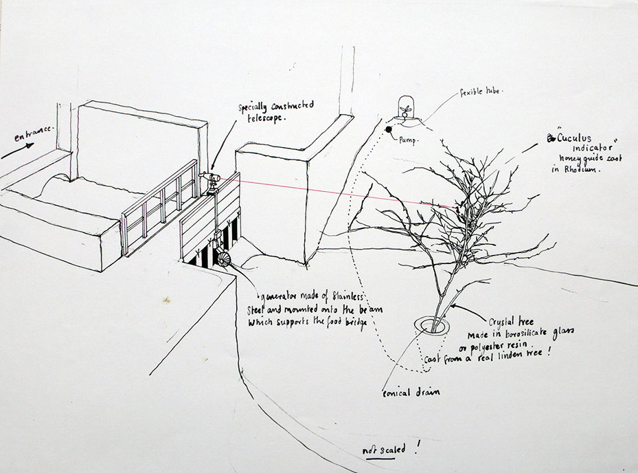 Indicator Fur Burg Vischering: Proposed model showing the linden tree, Tilia tomentosa made of stainless steel concealing a cast cuculus indicator, bird, water flowing through the weir gate is key to monitoring the installation. 1999