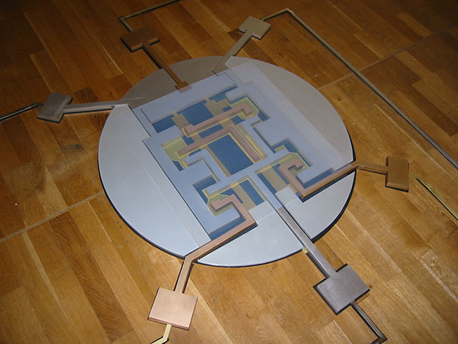 New York-New York: The Integrated circuit, constructed from brass and aluminum with multiple layers of insulation made from woven silica. The circuit is based on the 1959 Fairchild “flip –flop” integrated circuit. The circuit converts high frequency current from the generators to alternating current used by New York-Hot and New York- Cold. C.1989