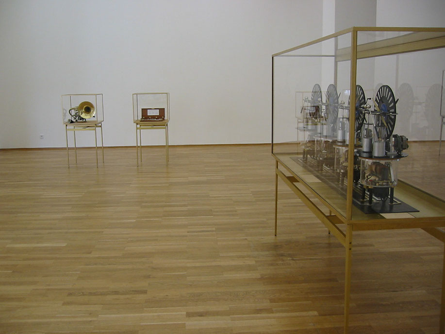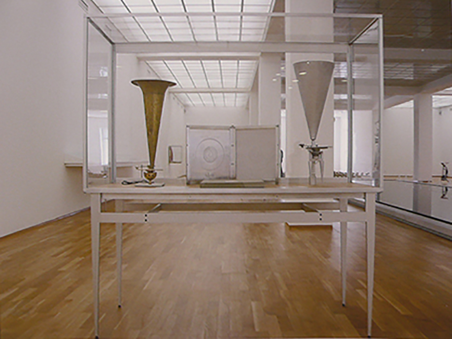 New York–New York: Vitrine holding New York High (brass phonograph), New York High–New York Low, (record edition), and New York Low (aluminum phonograph), 1986–89. See Music