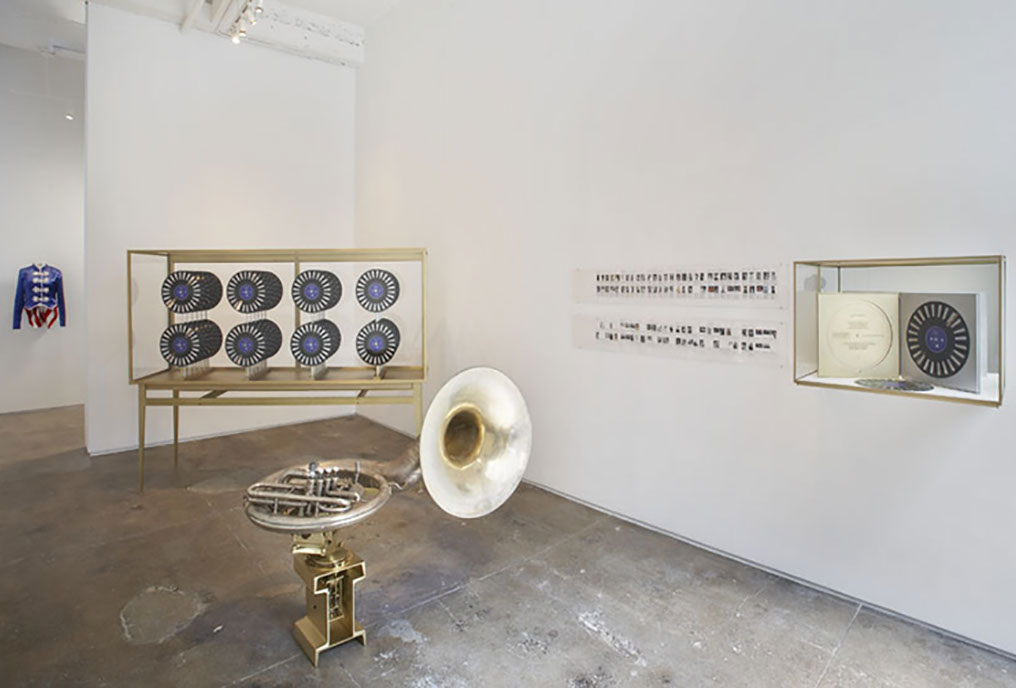 New York–New York: Two Mechanical Symphonies for Two Cities, Sousaphonograph, the Record Vitrine containing 48 prepared recordings, the Record Timelines, a record presented in a vitrine and the costume for the Influence Assistant, installation view Christine Burgin Gallery, New York. 2006.