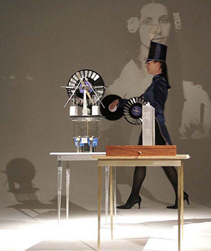 New York–New York: Performance of the Influence Assistant demonstrating the insertion of Influence Isolators in an Electrostatic Generator in Two Mechanical Symphonies for Two Cities at Christine Burgin Gallery, New York. 2006.