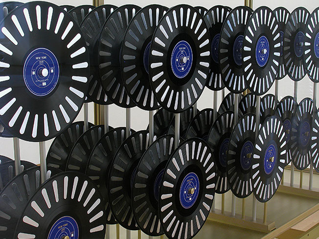 New York–New York: The Influence Isolators in the Record Vitrine, brass, aluminum and Bakelite, 72 x 24 x 66 in., 48 specially prepared records comprise this audio archive. 1994–2003.