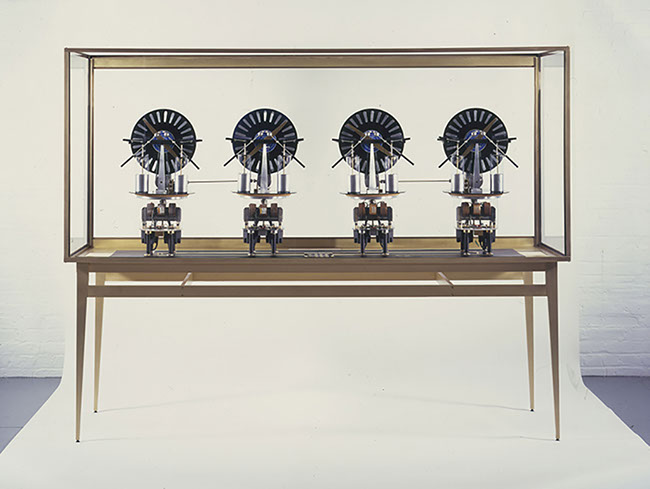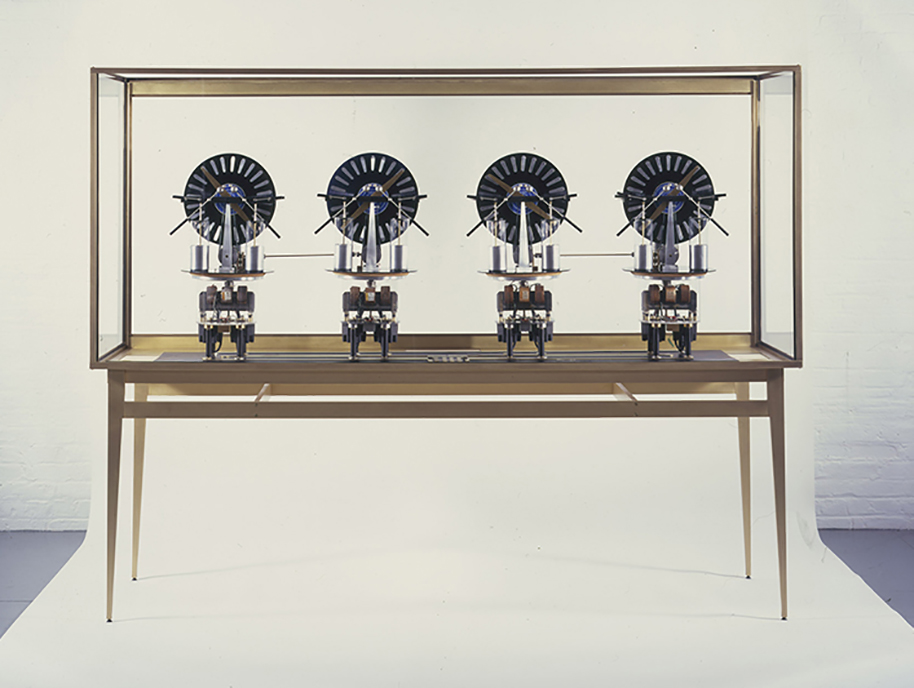 New York–New York: The Electrostatic Generators in a specially constructed brass vitrine; these generators power the Integrated Flip–Flop Chip. Brass, Bakelite, rubber, and polycarbonate, 72 x 24 x 66 in. 1990–94.