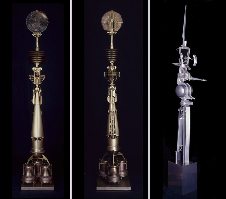 Begun in 1986, its three main structures, New York Hot, New York Cold, and the Lake, were scaled in approximate proportion to Central Park. Both New York Hot and New York Cold use water from the Lake and transform it with self-generated electricity (employing the Electrostatic Generators) to form steam (in the case of New York Hot) and ice bonds (New York Cold, employing the New York Ten). This metaphor, simply explained here, is enlarged by many further elements and processes within the entire installation, creating a portrait of Manhattan with water its central focus. The project is the most ambitious to date it has over thirty sculptures involved in mechanically and metaphorically dealing with its subject. New York-New York has an alchemical quality to it, built entirely out of Brass on the hot side and Aluminum on the cold side; water is manipulated as transformative material in its portrayal of its subject . For further reading consult The Metropolis of Metaphorical Intamations