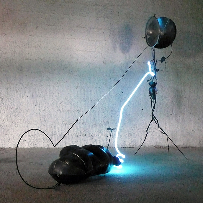 When the male activates his tail it flicks forward and strokes the copper protuberance so completing the circuit and thus illuminating the translucent gas filled glass tube connecting the two amorous creatures. The two, on sensing the blue haze cast by their joint efforts, switch themselves off momentarily. The male restores his tease, once the light level has reduced its potency.