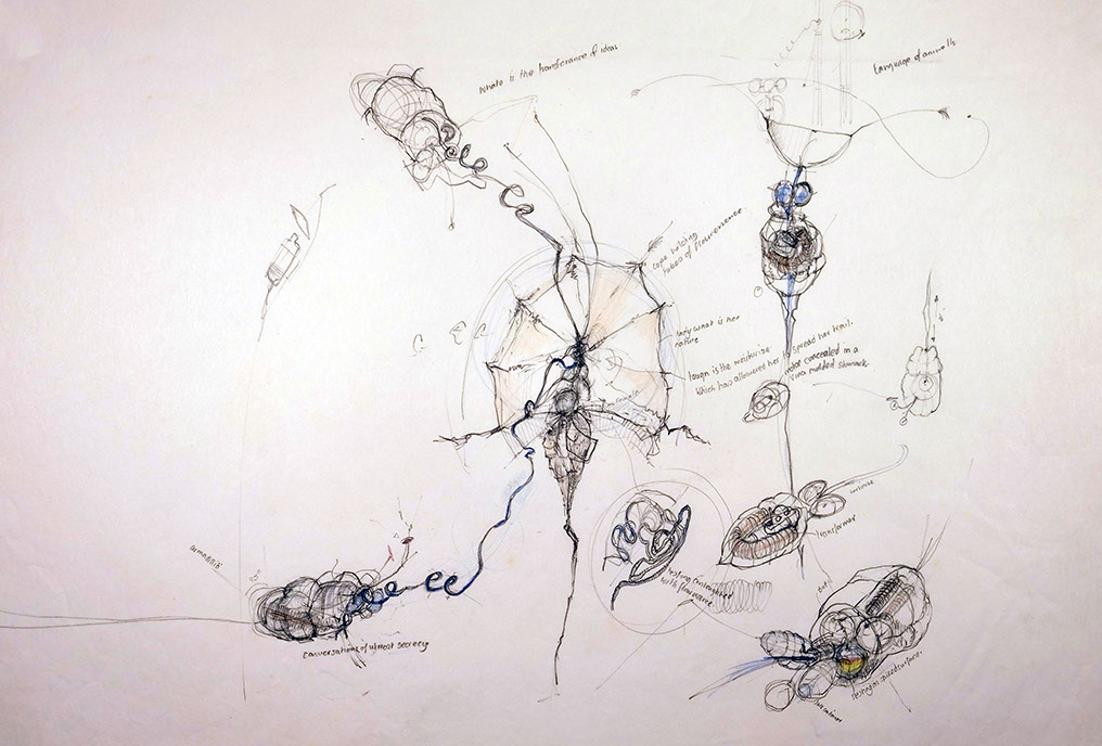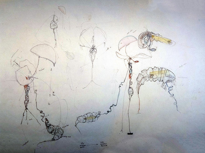 Nocturnal Courting Behavior: Early preparatory drawing, India ink and crayon on layout paper. 1979