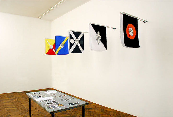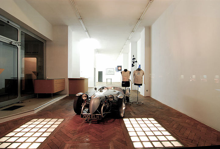 Panhard Special: The five Racing flags used in Lingotto, these were inserted at each consecutive floor as the car sped onwards, transforming the south spiral ramp leading to the racetrack into a palace of memory. Galerie Hubert Winter, Vienna. 2007.