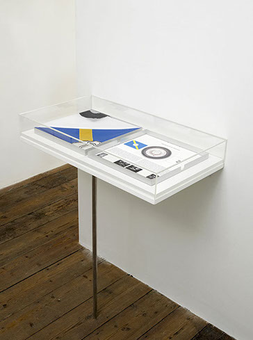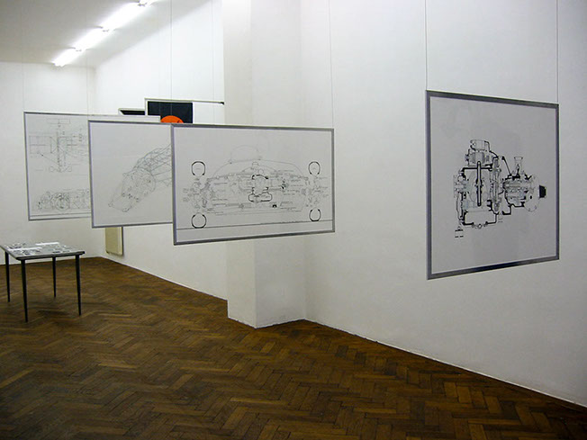 Panhard Special: The original drawings of the Panhard Special suspended in space, with historical documents on the table in the background, Galerie Hubert Winter, Vienna. 2007. See Edition