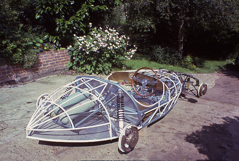 Panhard Special: The completed space frame with suspension fitted and nitrous oxide bottles in the tail section. 1977