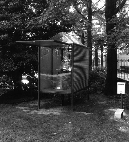 Purification of Fagus Sylvatica var pendula: Pavilion housing the glass borosilicate distillation still and the equipment used in the performance Purification. Installed in Weeping Beech park, Queens, New York. 2001 See Books