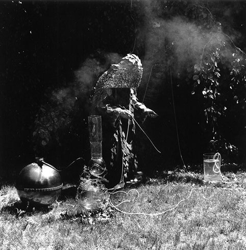 Purification of Fagus Sylvatica var pendula: The left hand of the figure touches the secondary chamber of the still, prior to placing the smokestack in position. Photo: Janette Beckman. 2001.