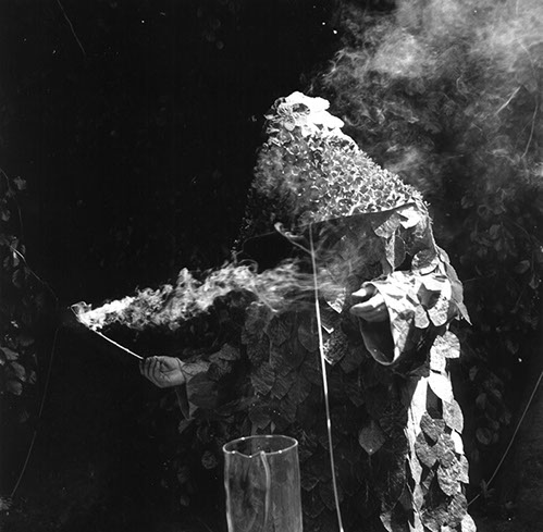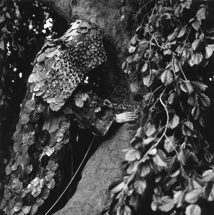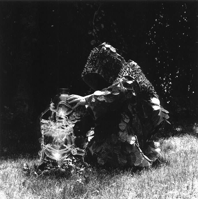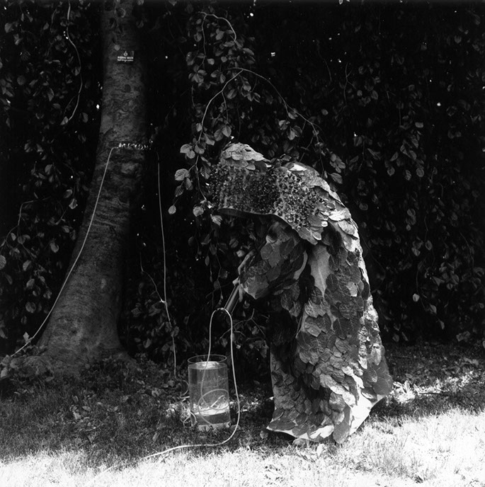 Purification of Fagus Sylvatica var pendula: The hooded apparition standing on top of the stump of the oldest Weeping Beech in America. The leaves on the cloak have been taken from the stump’s seven encircling progeny. Photo stills from the film Purification, Janette Beckman. 2001 See Edition