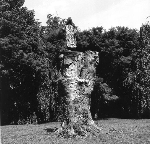Purification of Fagus Sylvatica var pendula: The figure removes the names of the Pleiades from the seven living beeches and repositions them around the mother stump, adding to each star’s name its astronomical coordinates. The second circulation of water now takes place between the pavilion and the mother stump. Photo: Janette Beckman. 2001 See Book