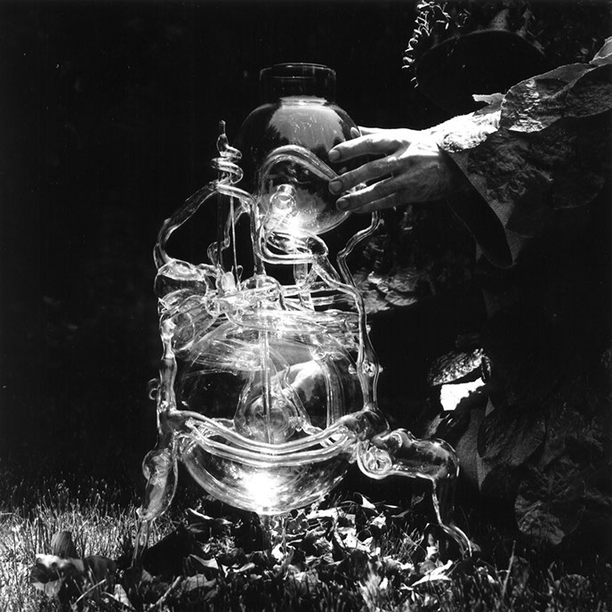The Photo series and film viewer describe the first stages of the distillation a leafed apparition using a specially constructed glass still, and smoke buoy, initially attaches seven glass names to the seven existing beeches circling the original mother stump, the names are those of the Pleiades. The seven daughters of Pleione and Atlas: Alcyone, Celaeno, Electra, Maia, Merope, Sterope, and Taygete By circulating water through these names an antiseptic distillate was obtained from condensing the smoke.