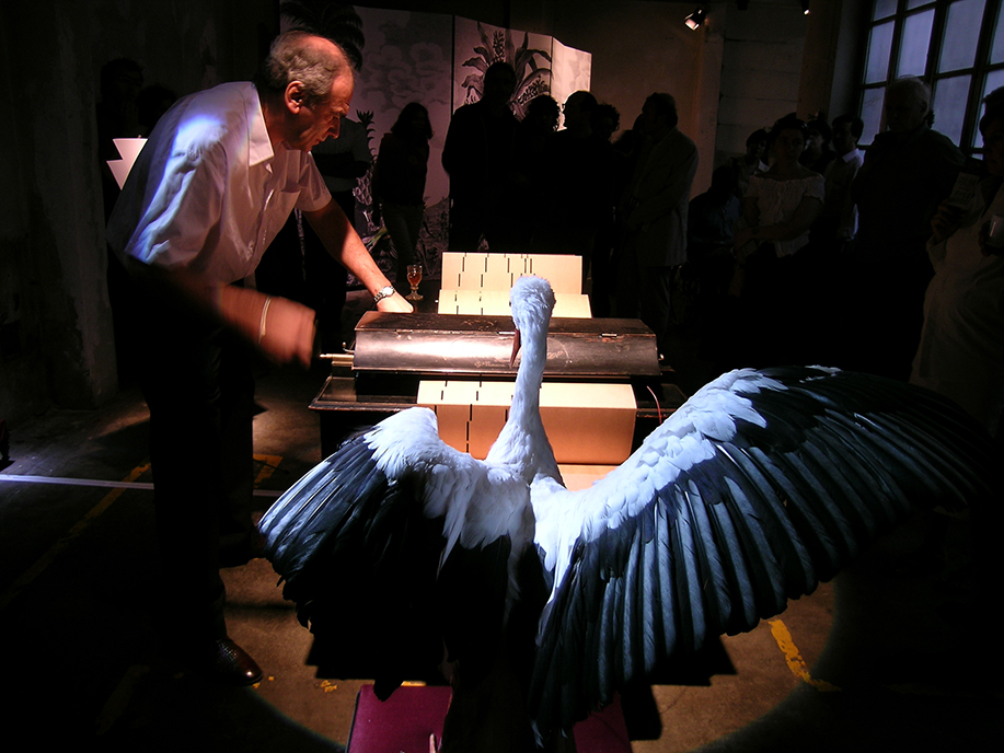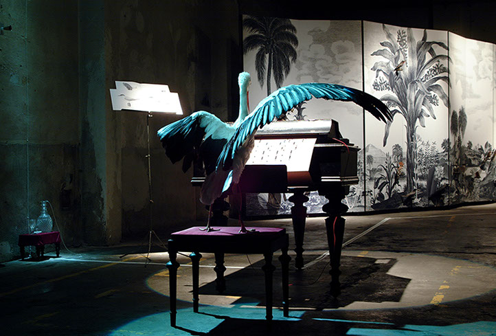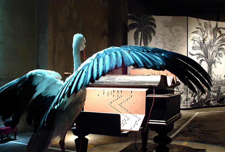 The Still extracts pure alcohol from the Punt e Mes, which then trickles to, and sensitizes, the Pump, thus sensitizing the Pump. The alcohol then travels to the piano where the conductor determines when a performance may commence. Another factor determining the installation’s operation are the thermal sensors placed in the performance area which regulate the distribution of various herbal essences by the Pump,creating the air pressure required for the birds’ whistles. As visitors walk through the space they constantly modify the conditions monitored by the sensors,thus ensuring that every performance is unique.