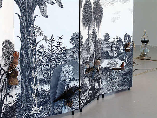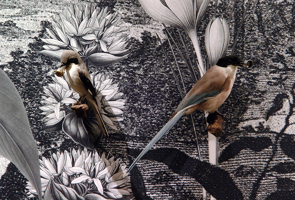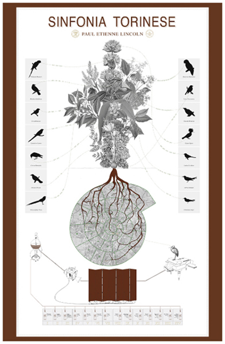 Mounted on this screen are fourteen migratory songbirds that originate in the same locales as the various plants, and which fly to northern Italy each year to sing and mate. Sinfonia Torinese employs a rare Italian automatic Racca piano to play a score from the silent movie Cabiria (dir. Giovanni Pastrone, 1914). When the score is played, the birds sing through minute whistles mounted in their beaks; the whistles are air-powered and regulated by the Peristaltic Pump.