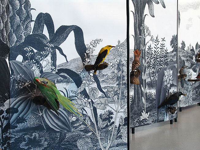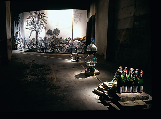 Manufactured by Carpano, Punt e Mes is an old and respected Torinese aperitif, which in this installation serves as the catalytic fuel. Several of the aperitif's secret herbal constituents were identified by chromatography, and these were used to establish the images of the lush foliage depicted on a large folding screen. This seven-paneled screen has twenty separate engravings intricately commingled to form one picturesque view. (The original etchings were among the first images of these New World plants.)