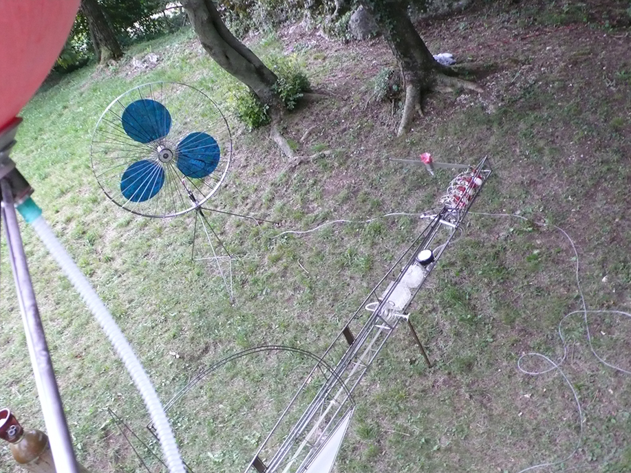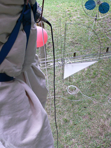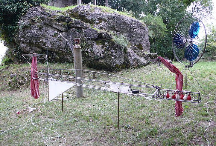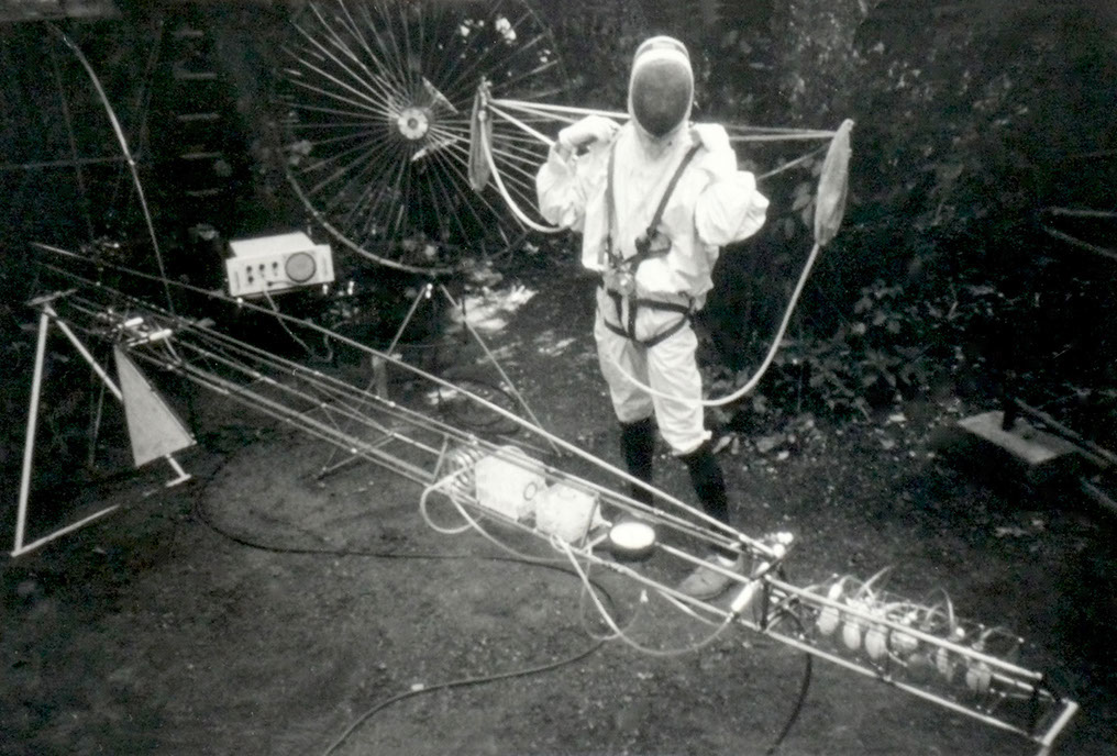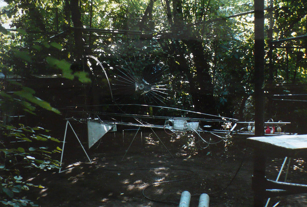 Air and thought are both intangible and ubiquitous and in both cases it is the mechanisms in Theraputica that reveals and manifests its form. Four attempts over the years to film a performance were abruptly terinated by inclement weather the only surviving evidence of the performance is through photographs these explicate the role each part plays in this early process work.