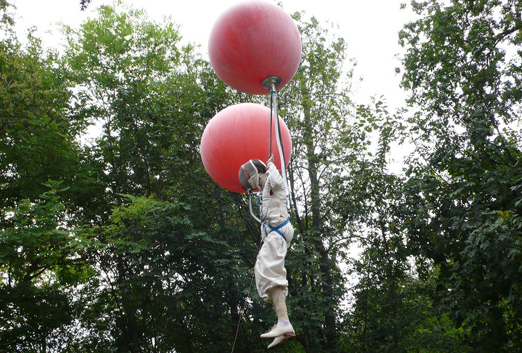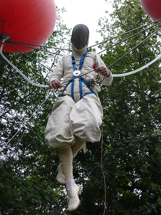 The work existed as a single performance during which the main fuselage floated in air supported by helium filled meteorological balloons together with the artist floating in the same locality while electrically connected to the oscilloscope.