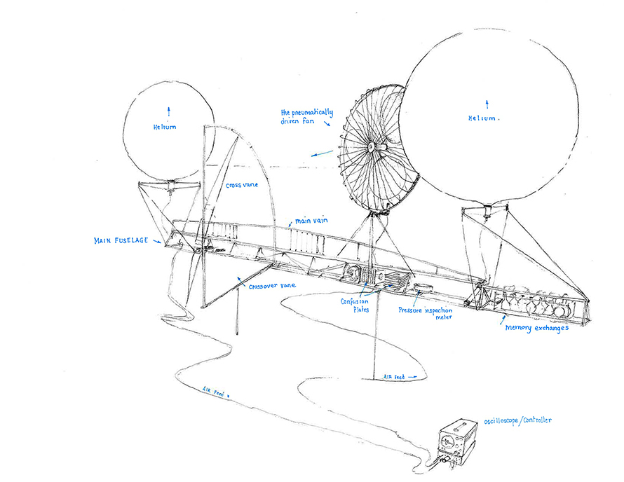 A series of sensors attached to various parts of his body influenced the pulsing of air exiting the oscilloscope /controller to the pneumatic fan, as well as controlling the pitch,roll and yaw of the fuselage .The fan would randomly affect the vanes on the fuselage switching air (conscious matter) to operate various parts of the structure. The outcome was to avoid buildup of matter in the memory exchanges (small interlocked balloons), which could inevitably cause the performances termination. The effects and outcomes of using air as a metaphor for thought could be observed as if in a three-dimensional planar model when viewing the fuselage’s confusion plates.