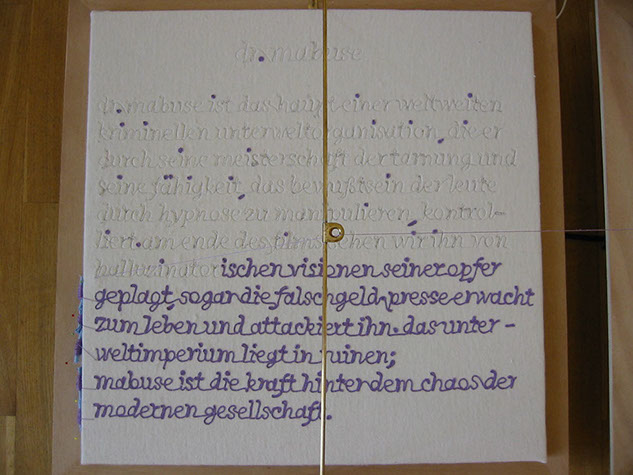Four tapestries surround the braider, each is embroidered with texts and symbols representing a different aspect of Berlin’s history: a Durchsteckschüssel, a type of double-headed key found only in Berlin; a synopsis of Fritz Lang’s expressionist film Dr Mabuse, 1922; a Linden leaf, and its attendant mythology; finally a map of Berlin indicating the original gates to the inner city. During the course of the exhibition the embroideries are gradually unpicked, but the texts and images remain readable from the pattern of their stitch holes.