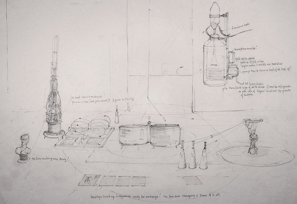 Die Berliner Zukebarin: An early layout of various elements, the braiding machine and the relationship to the tapestries, were later changed. 2002.