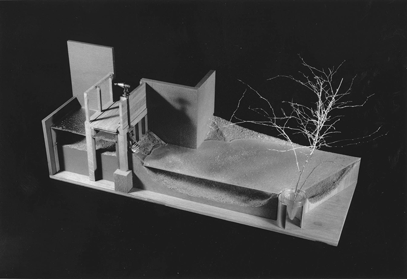 Indicator Fur Burg Vischering: Proposed model showing the linden tree, Tilia tomentosa made of stainless steel concealing a cast cuculus indicator, bird, water flowing through the weir gate is key to monitoring the installation. 1999