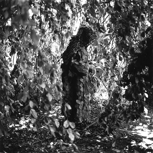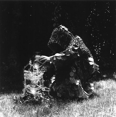 Purification of Fagus Sylvatica var pendula: The hooded apparition standing on top of the stump of the oldest Weeping Beech in America. The leaves on the cloak have been taken from the stump’s seven encircling progeny. Photo stills from the film Purification, Janette Beckman. 2001 See Edition