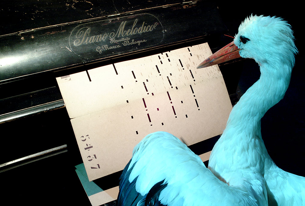 Mounted on this screen are fourteen migratory songbirds that originate in the same locales as the various plants, and which fly to northern Italy each year to sing and mate. Sinfonia Torinese employs a rare Italian automatic Racca piano to play a score from the silent movie Cabiria (dir. Giovanni Pastrone, 1914). When the score is played, the birds sing through minute whistles mounted in their beaks; the whistles are air-powered and regulated by the Peristaltic Pump.